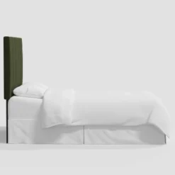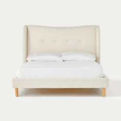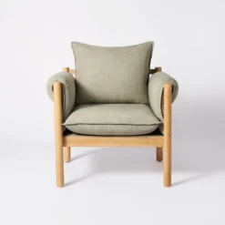 - Woven cotton textile contrasts with wooden frame