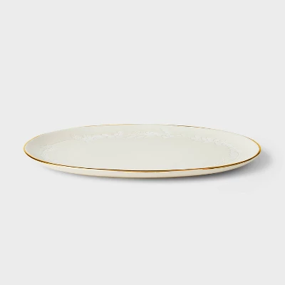 Elevate your festive gatherings with this Stoneware Serving Platter from Threshold™ designed with Studio McGee. This serving platter features a pristine white surface adorned with an etched floral pattern and a golden rim for a visually appealing presentation. Made from stoneware, this oval dish is the ideal choice for serving snacks, starters, bread or other delectable appetizers. Plus, it’s dishwasher and microwave safe for easy cleaning and reheating.